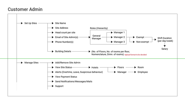We started by creating a flow for the customer admin as a customer admin is the perfect superset of all types of users. A customer admin has access to all the features, thus it helps to define their workflow and remove features from the flow to accommodate it for other user types.