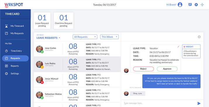 We decided to leverage the users’ familiarity with messaging applications to solve this problem. A messaging interface was created for requesting and approving leave, PTO and overtime requests. Employees can send a request by filling a simple form and converse with their admins to make these requests.