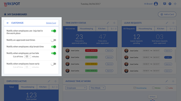 The admins will get alerts about any problems or suspicious activities on their dashboard which makes it easy for them to make quick decisions and avoid disasters. Apart from that they can view and approve timecards and leave requests from employees right from the dashboard screen.